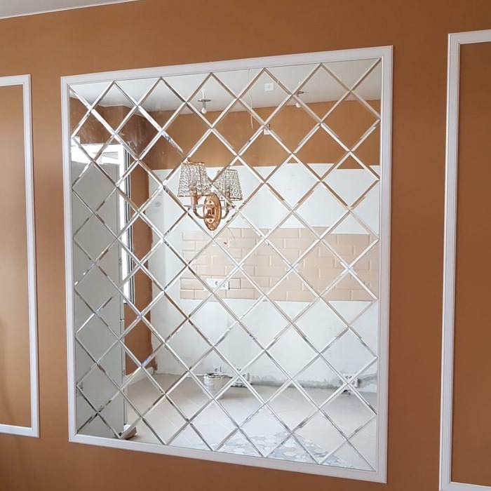 Использована зеркальная плитка вытянутый ромб размерами 20х34.